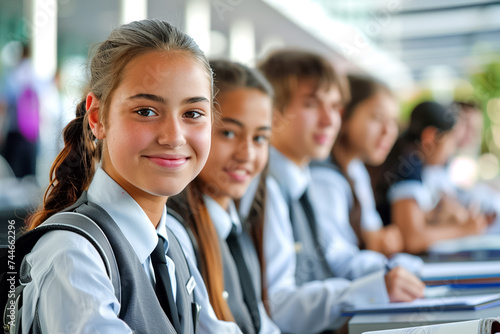Teen Girl in Uniform on First School Day. A joyful teenage girl wearing a school uniform and backpack beams on her first day back at a vibrant school campus.