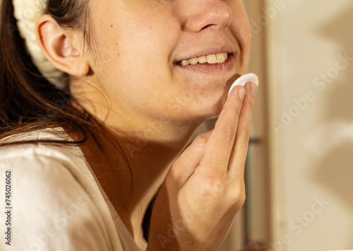 teenage girl wipes her face with a cotton sponge with tonic