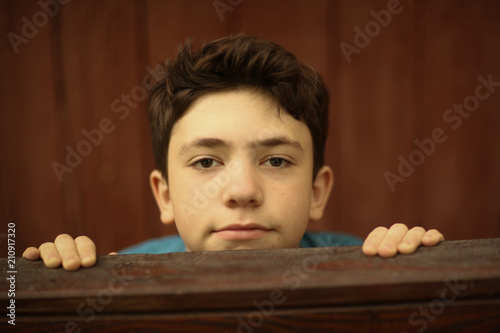 teenager boy close up portrait on brown wooden wall background