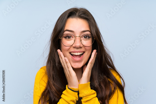 Teenager girl over isolated blue wall with surprise facial expression