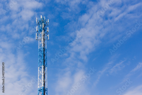Telecommunication tower for 4 G and 5 G cellular. Wireless communication antenna base transciever station with radio antennas isolated on blue sky background.