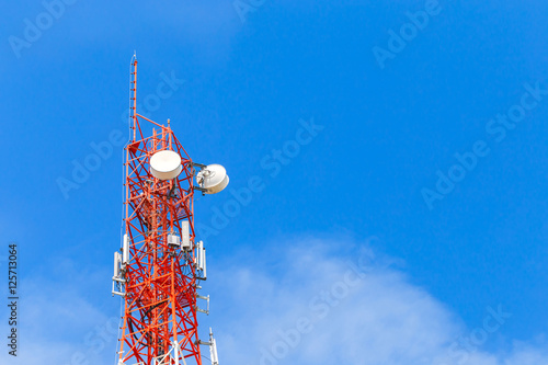 Telecommunication tower in cellular network. Blue sky with clouds background.