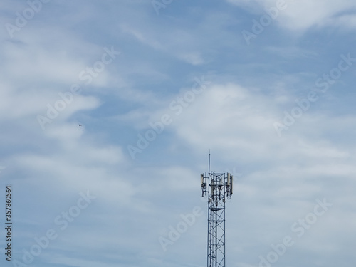 Telecommunication tower of 4G and 5G cellular. Cell Site Base Station. Wireless Communication Antenna Transmitter. Telecommunication tower with antennas against blue sky background.