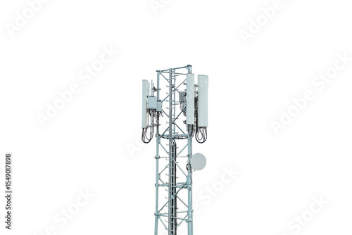 Telecommunication tower with antennas on white background