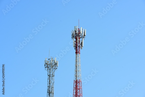 Telecommunication tower with antennas.High pole for signal transmission. There are both wireless phone systems and microwave systems.