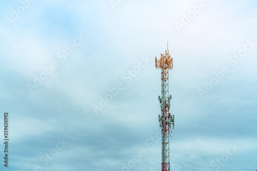 Telecommunication tower with blue sky and white clouds. Antenna on blue sky. Radio and satellite pole. Communication technology. Telecommunication industry. Mobile or telecom 4g network. Technology