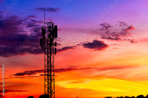 Telecommunication towers with colorful sky as a backdrop in the morning and sunlight reflecting off clouds create a stunning and mesmerizing light effect. Concept of innovation, technology and environ