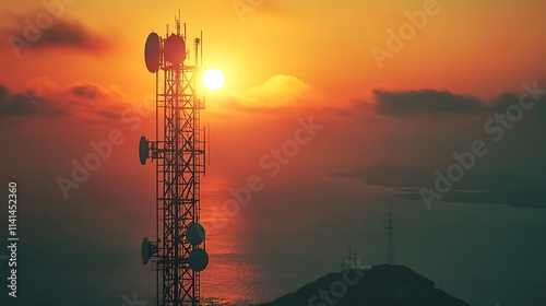 Telecommunications Tower at Sunset Over Coastal Hills. AI Generated