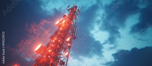 Telecommunications tower equipped with antennas for wireless signals representing concepts of 5G technology data transfer and positioning Vertical composition