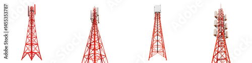 Telecommunications towers with red and white antenna structures. long_title:Tall, vertical telecommunication towers with red and white antenna