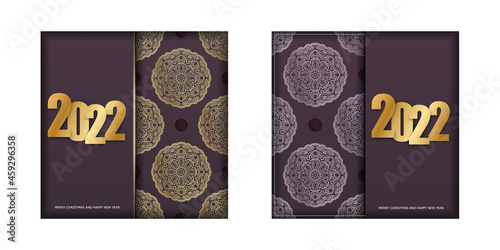 Template Greeting card 2022 Happy New Year burgundy color with vintage gold ornament