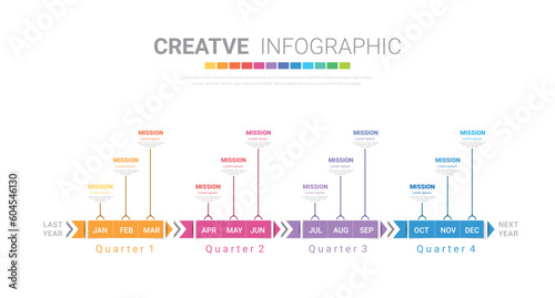 Template presentation 4 quarter, calendar presentation 12 months, Infographic Timeline can be used for workflow, process diagram, flow chart.