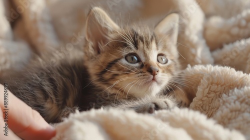 Tender Beginnings: Closeup of a Fluffy Kitten with Eyes Just Opening, Nestled on a Soft Blanket