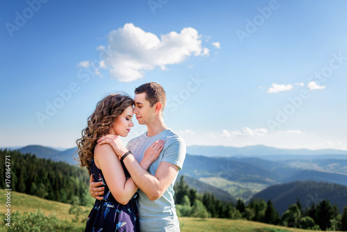 Tender hugs of a couple standing on a green hill before gorgeous landscape
