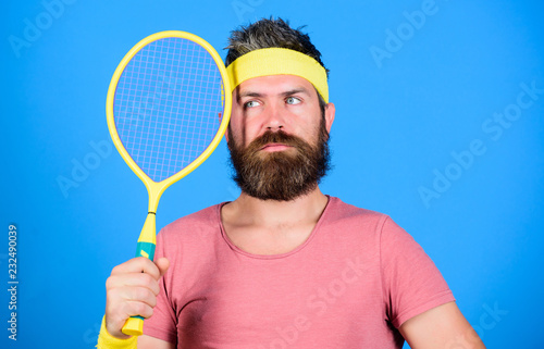 Tennis club concept. Man bearded hipster wear old school sport outfit with bandages. Tennis player retro fashion. Tennis sport and entertainment. Athlete hold tennis racket in hand on blue background