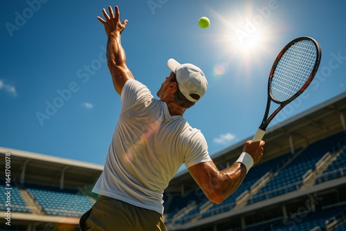 Tennis player serving ball in sunny stadium with clear sky in background.