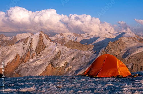Tent camp on the ice top of the peak with stunning mountain views at sunset; concept of outdoor activities in the wild