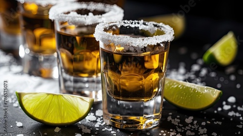 Tequila shot served with salt and lemon. Alcohol, glass, bar, club, vintage, wood. Casual evening in stylish place where people enjoy aromatic drinks and company of friends concept. Generative by AI