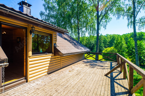 Terrace on the second floor in private country house. Sunny summer day. Green trees.