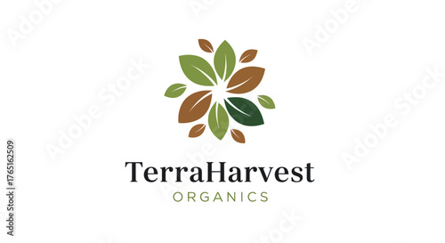 TerraHarvest Organics logo featuring a floral design with leaves in various shades of green and brown.