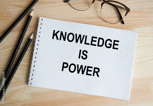 Text KNOWLEDGE IS POWER on the page of a notepad lying on financial charts on the office desk. Near the calculator and marker. Business concept.