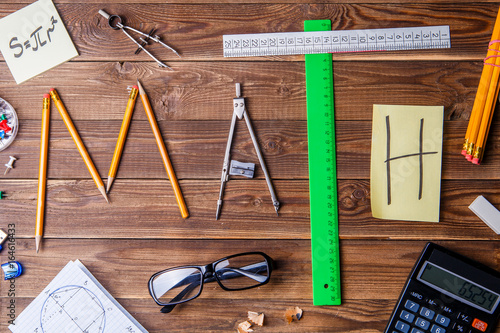 Text math composed of pencils, rulers, circular, sharpener and sticker with the letter
