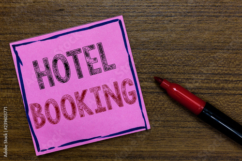 Text sign showing Hotel Booking. Conceptual photo Online Reservations Presidential Suite De Luxe Hospitality Purple Paper Important reminder Communicate ideas Marker Wooden background