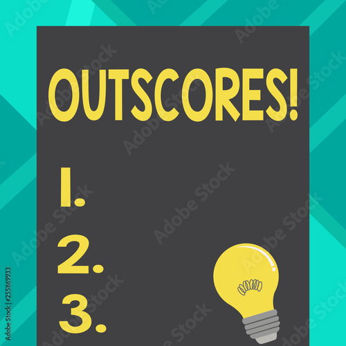 Text sign showing Outscores. Business photo text Score more point than others Examination Tests running Health care Incandescent Light Bulb with Filament Inside Resting on Blank Color Paper