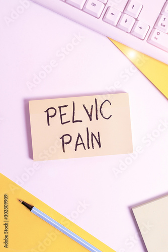 Text sign showing Pelvic Pain. Business photo showcasing Pain perceived in the area of the lower part of the abdomen Flat lay above table with pc keyboard and copy space paper for text messages