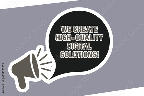 Text sign showing We Create High Quality Digital Solutions. Conceptual photo Making excellent modern options Megaphone with Loudness icon and Blank Speech Bubble in Sticker Style