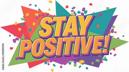 Text Stay Positive with Colorful Geometric Shapes and Confetti