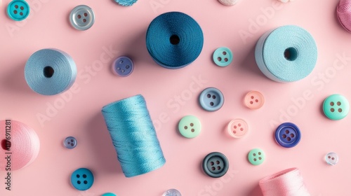 textile crafting elements, ombre blue thread rolls, light to dark gradient, complementary buttons scattered, blush pink background, flat lay design, professional studio lighting