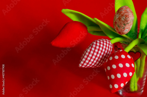 textile made by hand tulips tilde on a red background for text. Tilda toys. sewing for Valentine's Day and Women's Day. Spring background