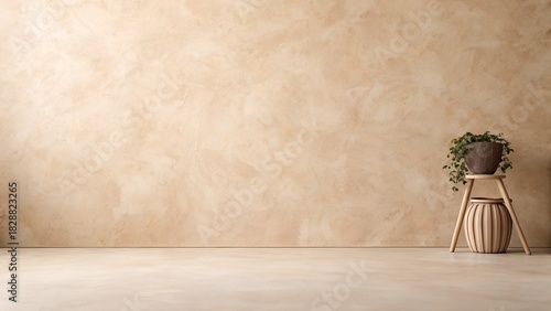 Textured Beige Wall With Potted Plant On Wooden Stool In Minimalist Interior Design