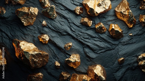 Textured black slate surface with scattered gold metallic rocks and natural appearance
