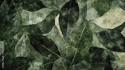 Textured green leaves layered over each other, creating a natural pattern in a close-up view