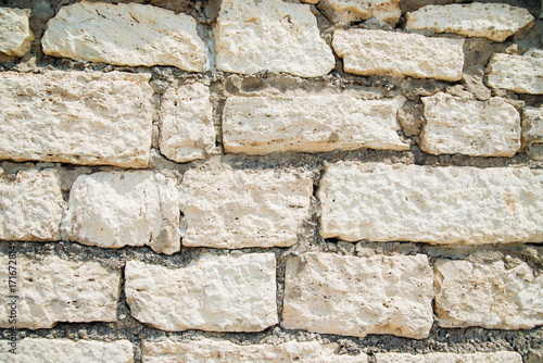 Textured wall of rectangular stone blocks in light beige shades and cement between them.