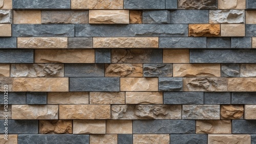 Textured wall with a blend of gray and beige stone bricks arranged in a modern pattern suitable for interior or exterior design backgrounds