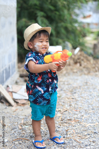 Thai boy aged 1 year 11 months playing Songkran water gun.