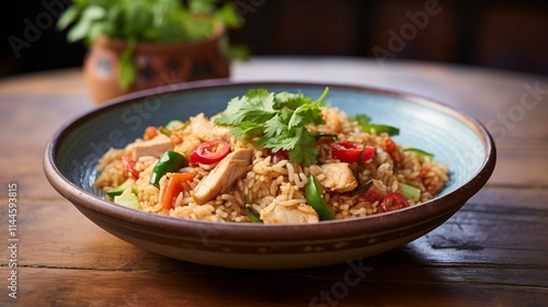 Thai fried rice with egg, prawns, and vegetables, ambient light, space on the left,generative ai illustration