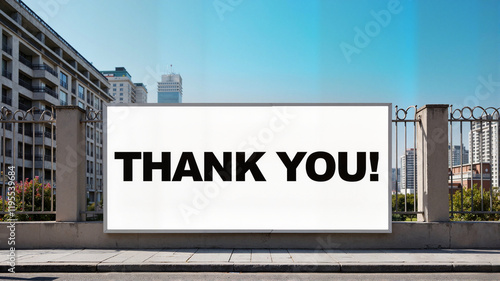 Thank you banner displayed in cityscape under clear blue sky, gratitude