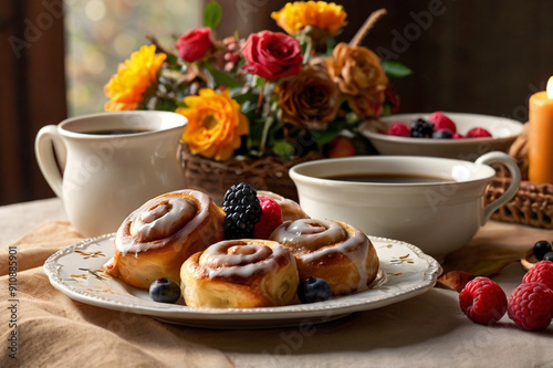 Thanksgiving Breakfast Scene with Coffee, Cinnamon Rolls, and Mixed Berries on a Beautifully Set Table with Fall Decorations