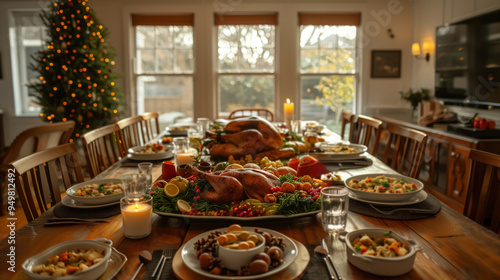 Thanksgiving dinner ready, turkey on the dinner table with different food.