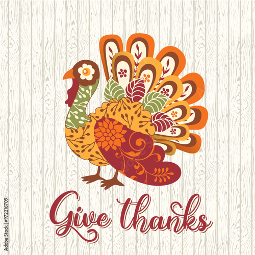 Thanksgiving Turkey Isolated with Give Thanks Text and Wood texture Background- Happy Thankgiving Illustration Vector Design