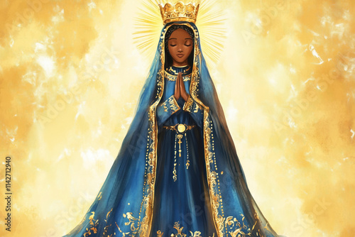 The African saintly figure Mary, Jesus’s mother, in prayer. Blue robe, golden crown. Nossa Senhora Aparecida, celebrated in Brazil and Catholic faith.