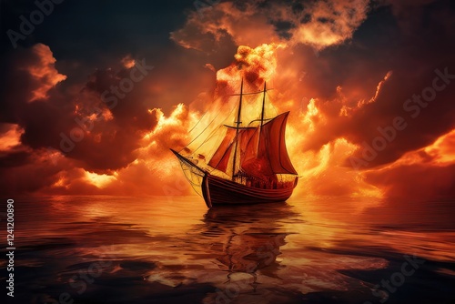 the AI Image Generator, Sailing Ship at Sunset With Dramatic Fiery