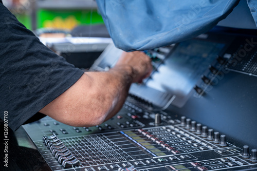 The arm of a sound engineer working on a mixing board. The whole set is covered by a tarpaulin.