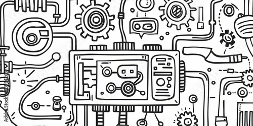 The Art of Coding: A Hand-Drawn Doodle of a Geared Machine Symbolizing the Concept of Functions in Programming, Ideal for Illustrating Software Development and Algorithm Concepts.