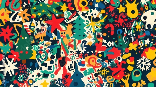 The artwork showcases a lively array of Christmas symbols like trees, stars, snowflakes, and gifts, celebrating the festive season. Generative AI