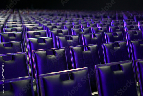 The atmosphere of a large conference room with rows of chairs.
